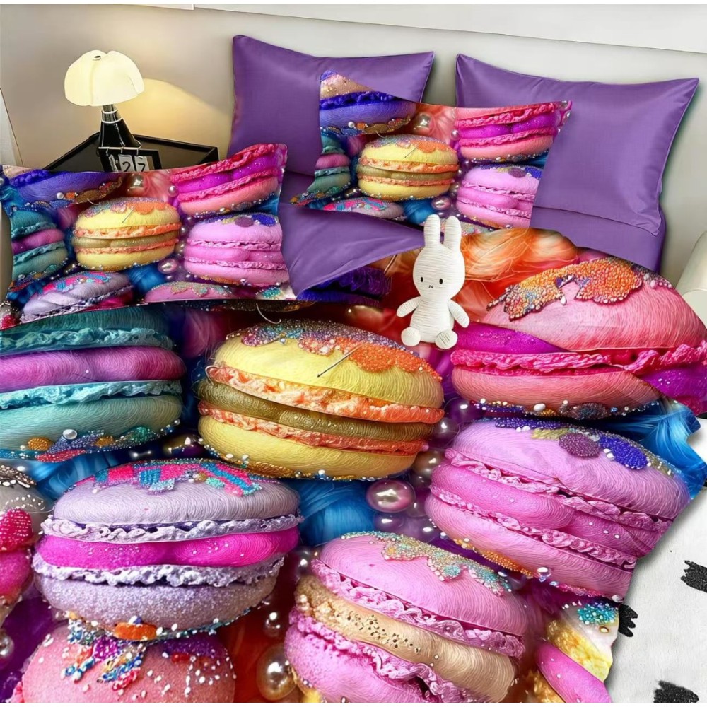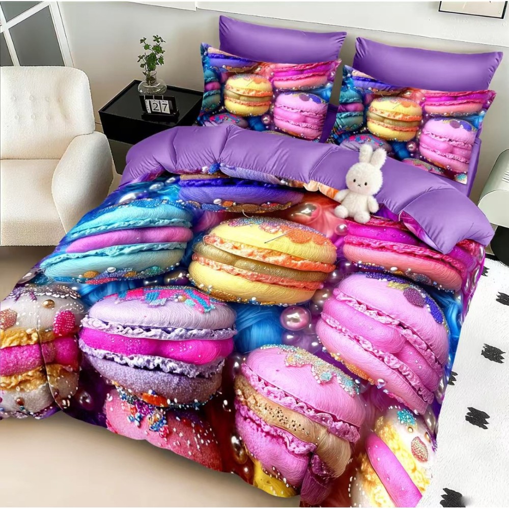 Lenjerie pat dublu, FINET, Imprimeu Digital 5D - Identic cu poza, Cu ELASTIC, 6 piese, Pucioasa, Multicolor, macarons, Johny Home Pucioasa, cod produs: SPR-5D-14