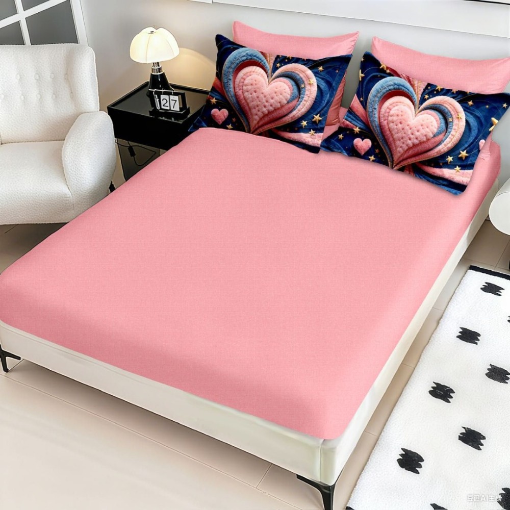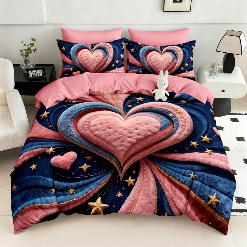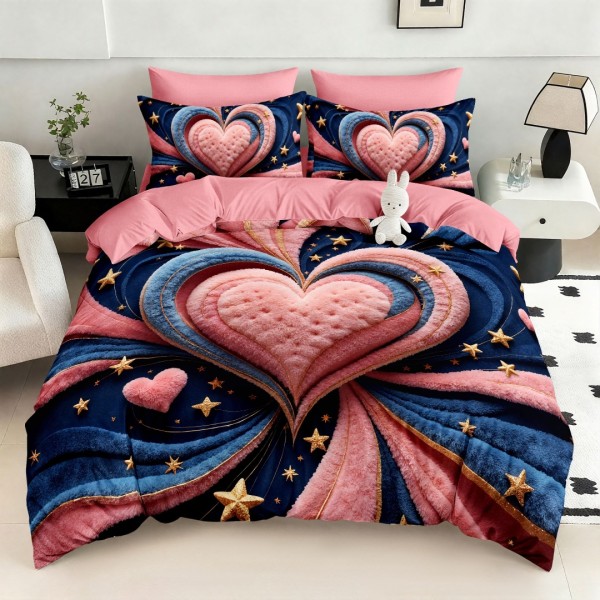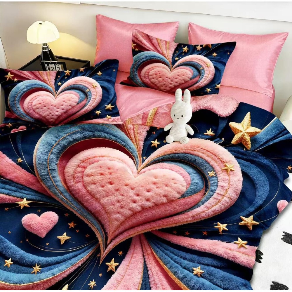 Lenjerie pat dublu, FINET, Imprimeu Digital 5D - Identic cu poza, Cu ELASTIC, 6 piese, Pucioasa, Roz, Albastru, inimioara, Johny Home Pucioasa, cod produs: SPR-5D-20