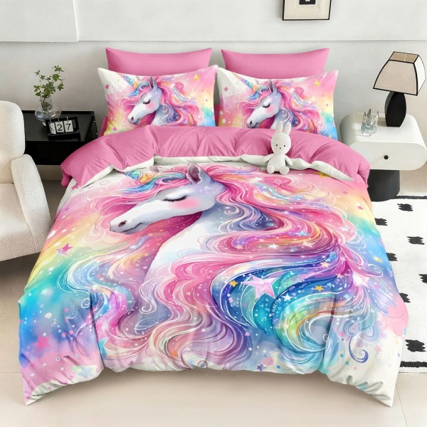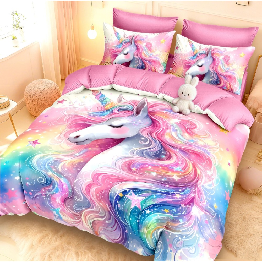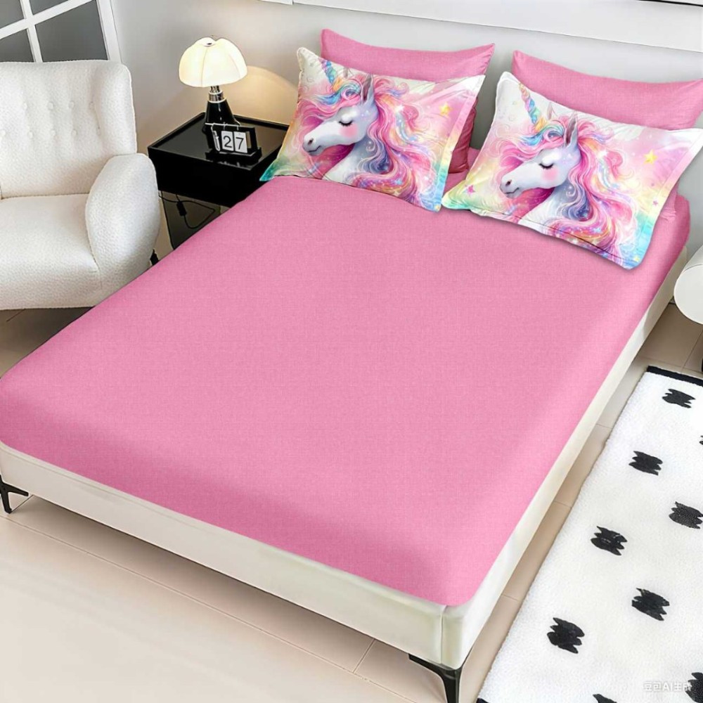 Lenjerie pat dublu, FINET, Imprimeu Digital 5D - Identic cu poza, Cu ELASTIC, 6 piese, Pucioasa, Roz, unicorn, Johny Home Pucioasa, cod produs: SPR-5D-19