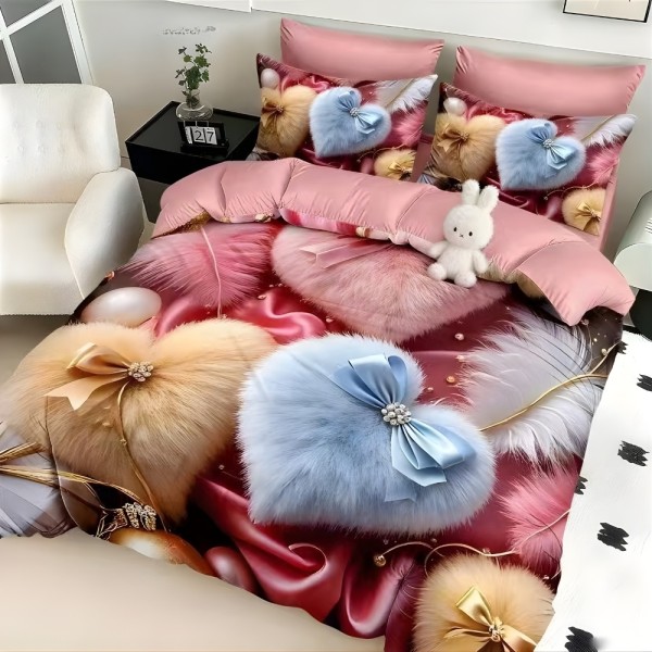 Lenjerie pat dublu, FINET, Imprimeu Digital 5D - Identic cu poza, Cu ELASTIC, 6 piese, Roz, inimioare pufoase, Talo, cod produs: SKT-5D-04
