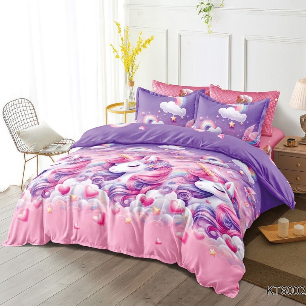 Lenjerie pat dublu, FINET, Kartoon Digital Print, cu Elastic, 6 piese, Roz, Mov, Unicorni, Inimioare, Primavara Casa, cod produs: PRM-KT6002