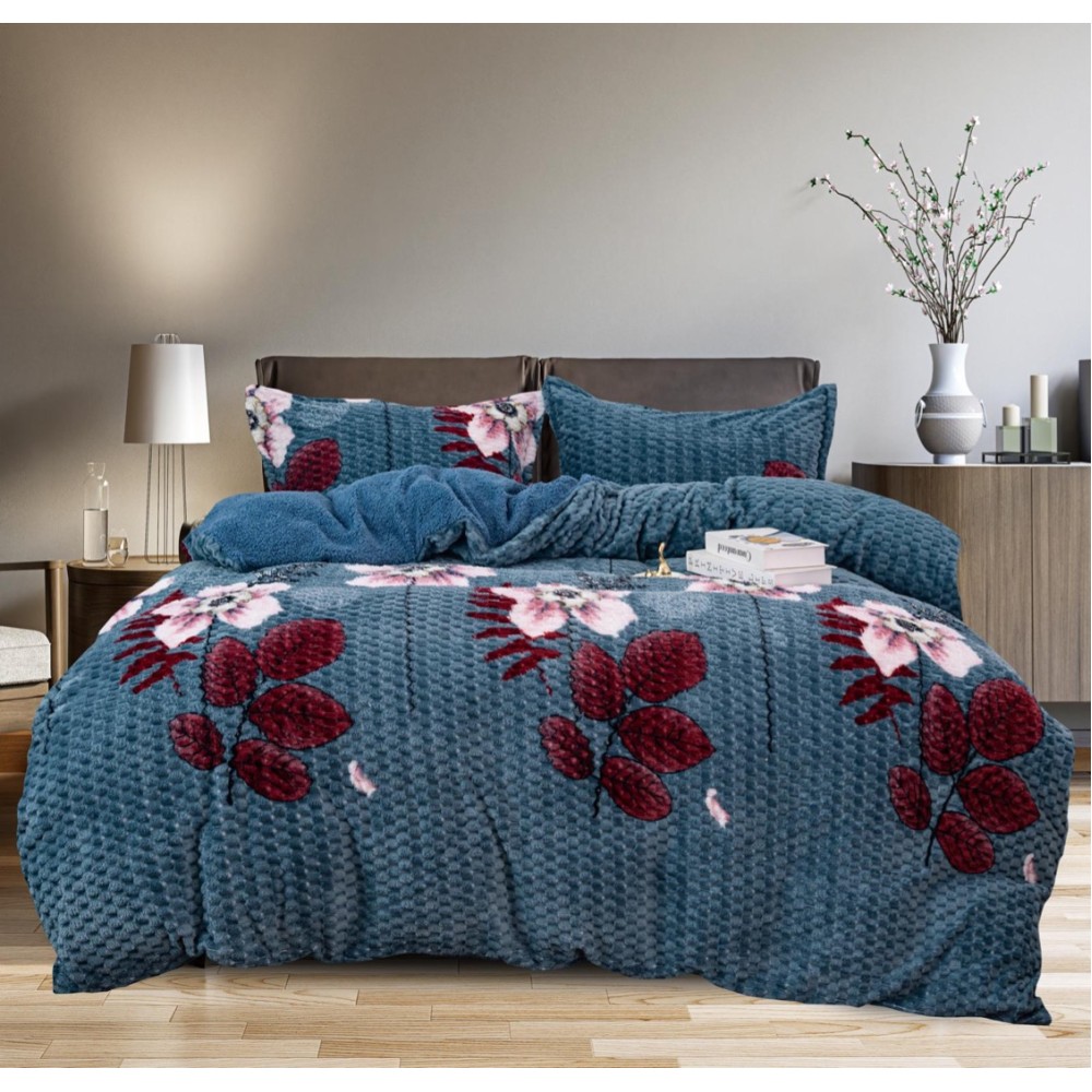 Lenjerie pat dublu, Super Pufoasa COCOLINO Creponata, 4 piese, Albastru, Flori și Frunze, Casa Creative Elegance Pucioasa, cod produs: BCC-LC-824