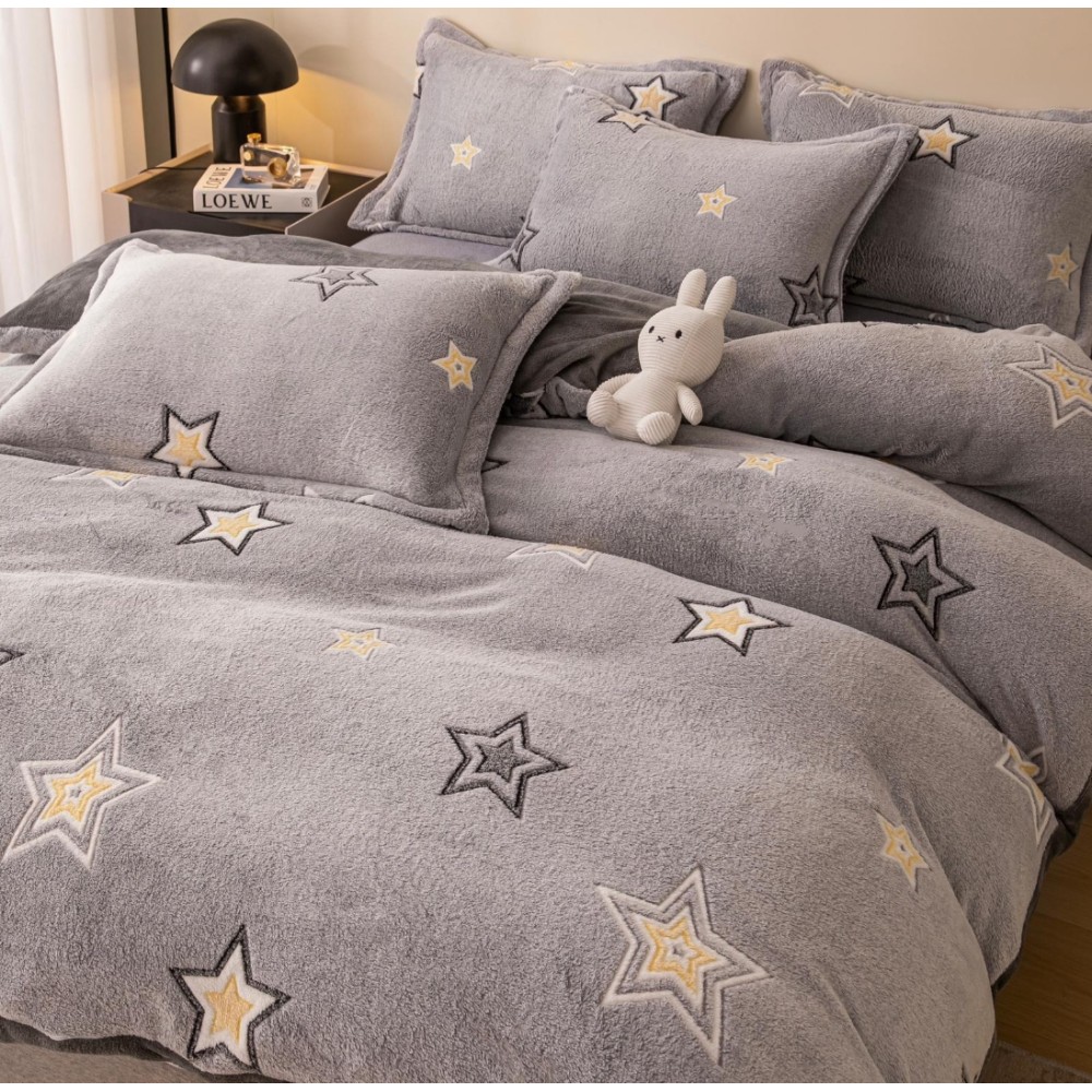 Lenjerie pat dublu, Super Pufoasa COCOLINO,cu ELASTIC, 4 piese, Jojo Home, Gri, Stelute, cod produs: JOJ-XHR-XL-22