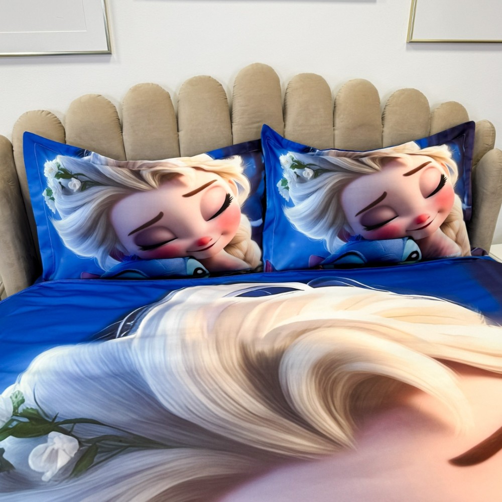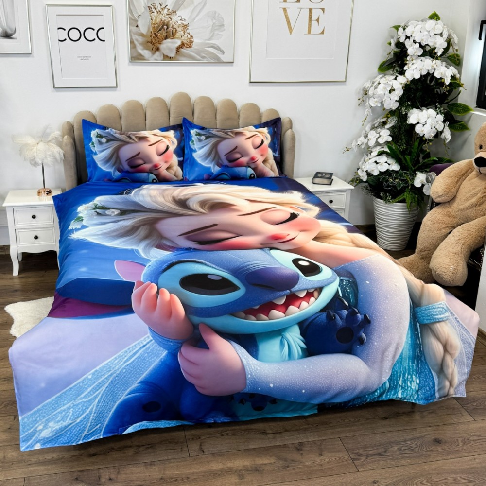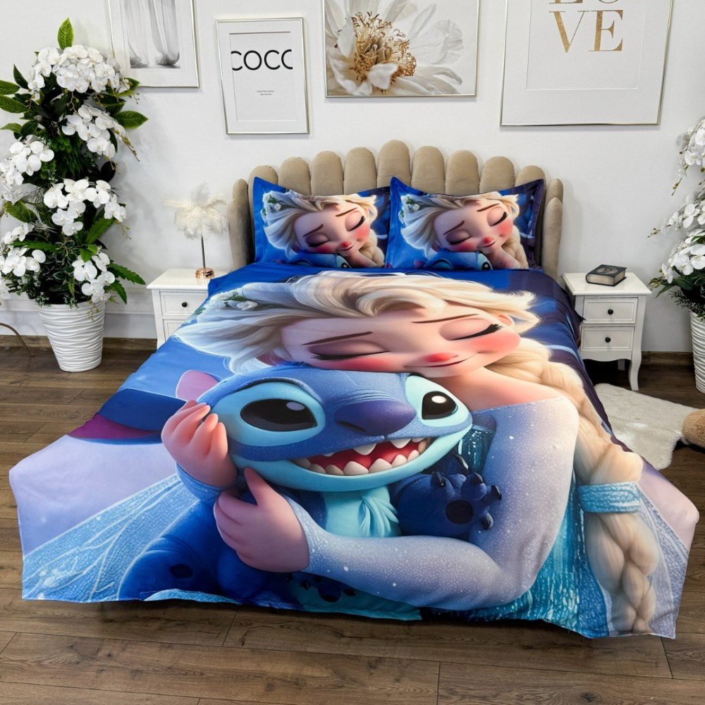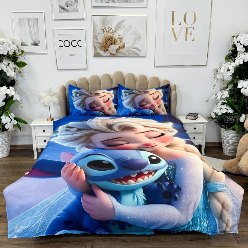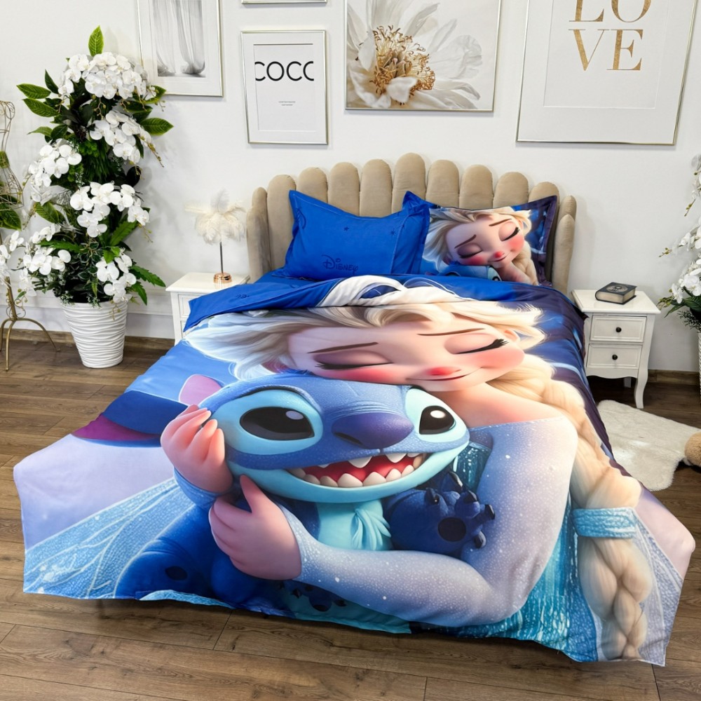 Lenjerie pat single (90x200cm, 100x200cm), FINET, 4 piese, IDENTICA CU POZA, Albastru, Elsa si Stich, Casa Minunata, cod produs: YN-DSN-20