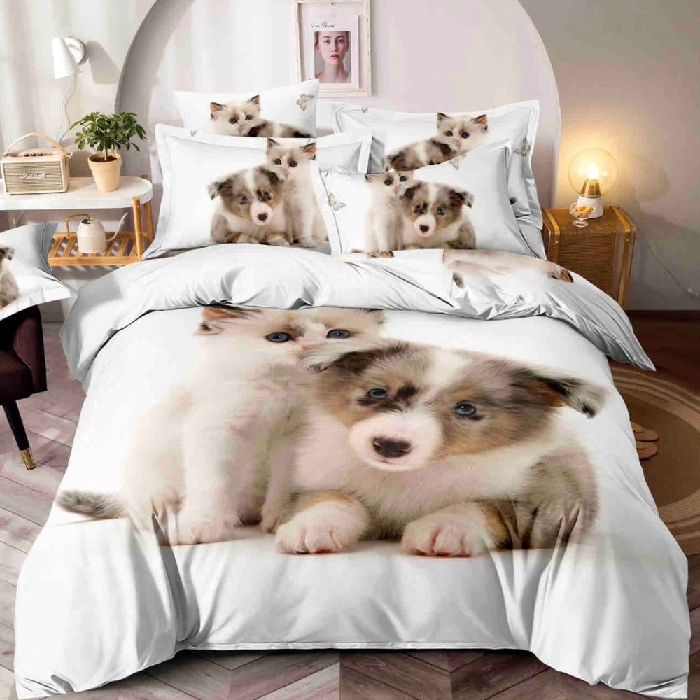 Lenjerie pat single, FINET, Imprimeu Digital - Identic cu poza, 4 piese, cu ELASTIC, Jojo Home, Alb, catel, pisicuta, cod produs: JOJ-AT-01