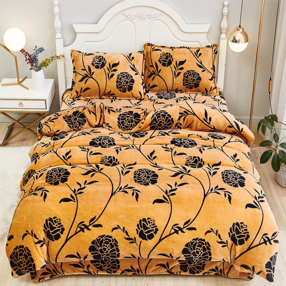 Lenjerie pentru Pat Dublu, Cocolino Premium, 4 Piese – Plușată, Groasă, și Călduroasă, Ideală pentru Iarnă – Confort Maxim, Antișifonare, Mustar, flori, CumparaMisim, cod produs: SDP-CC07
