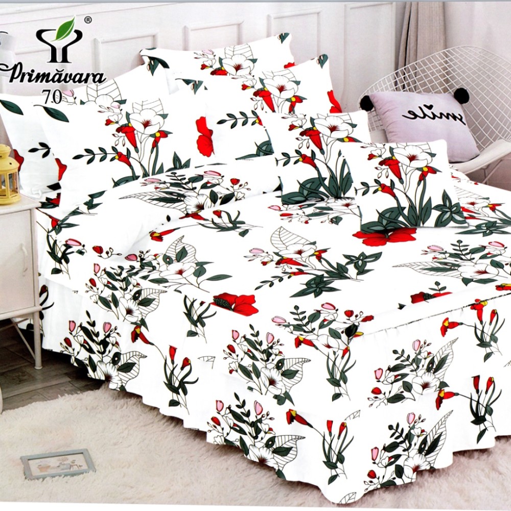 Lenjerie Premium Pat Dublu FINET, 6 Piese – Volanase Sofisticate, Fixare Perfecta cu Elastic, Alb, Verde, Flori, Primavara Casa, cod produs: PRM-K70
