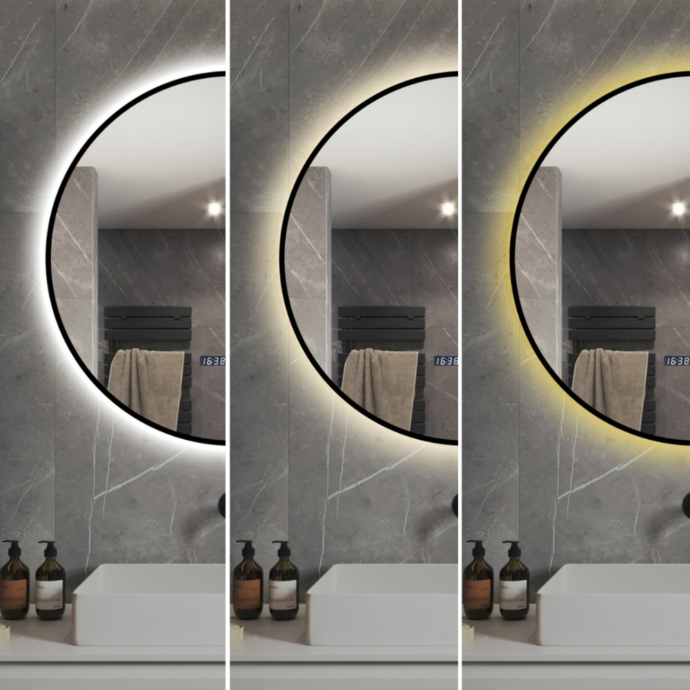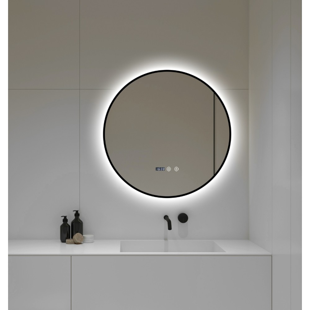 Oglindă Baie LED și Dezaburire, Ceas, Senzor Touch, Lumina Rece, Caldă și Neutră, 60 cm, Rama Negru, J181-6060, Smack, cod produs: SMK-J181-6060