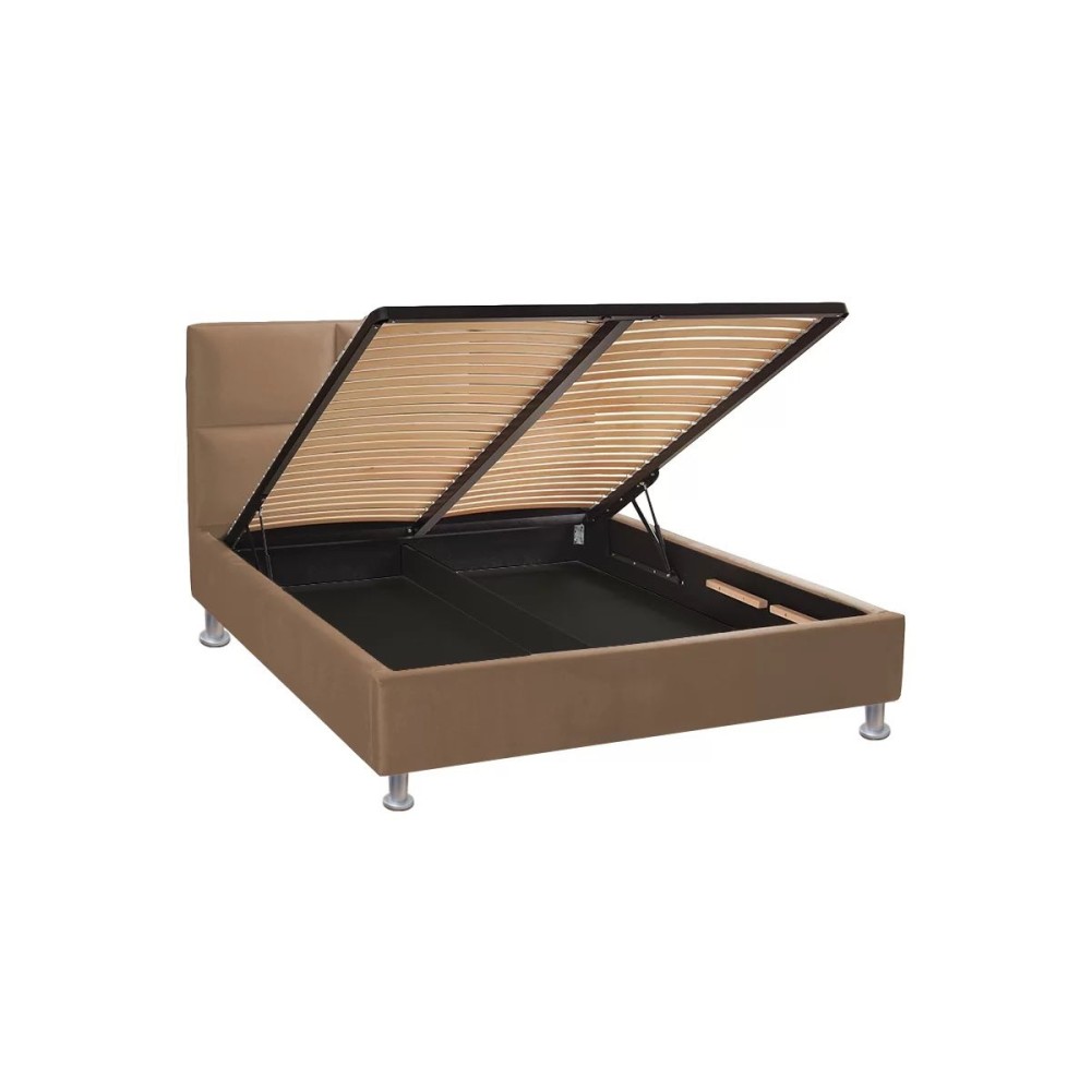 Pat tapițat din stofă plușată verde, somieră rabatabilă, ladă de depozitare generoasă, picioare din metal, structură cadru din lemn și PAL.