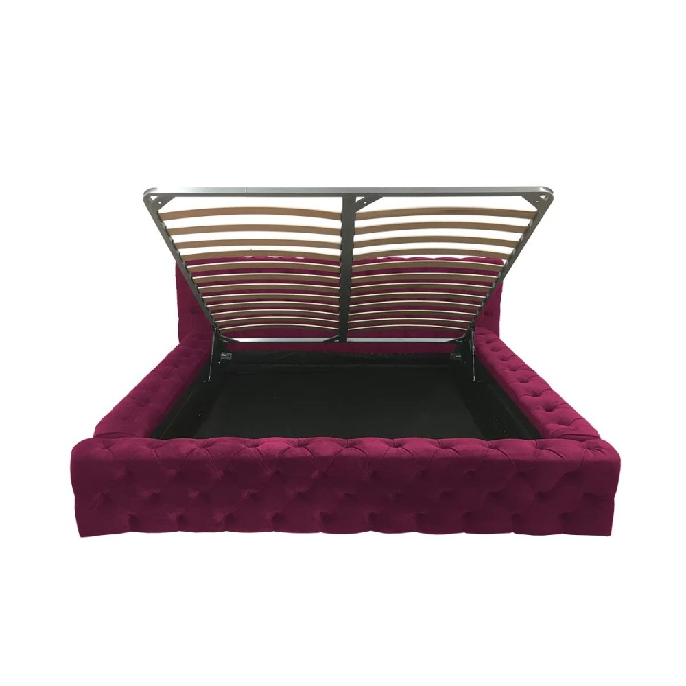 Pat matrimonial în stil Chesterfield cu dimensiuni totale de 180 x 240 cm, pentru saltea de 140 x 200 cm, tapițerie din catifea, tăblie înalta de 130 cm, cadru pat 33 cm, somieră metalică rabatabilă, ladă de depozitare.
