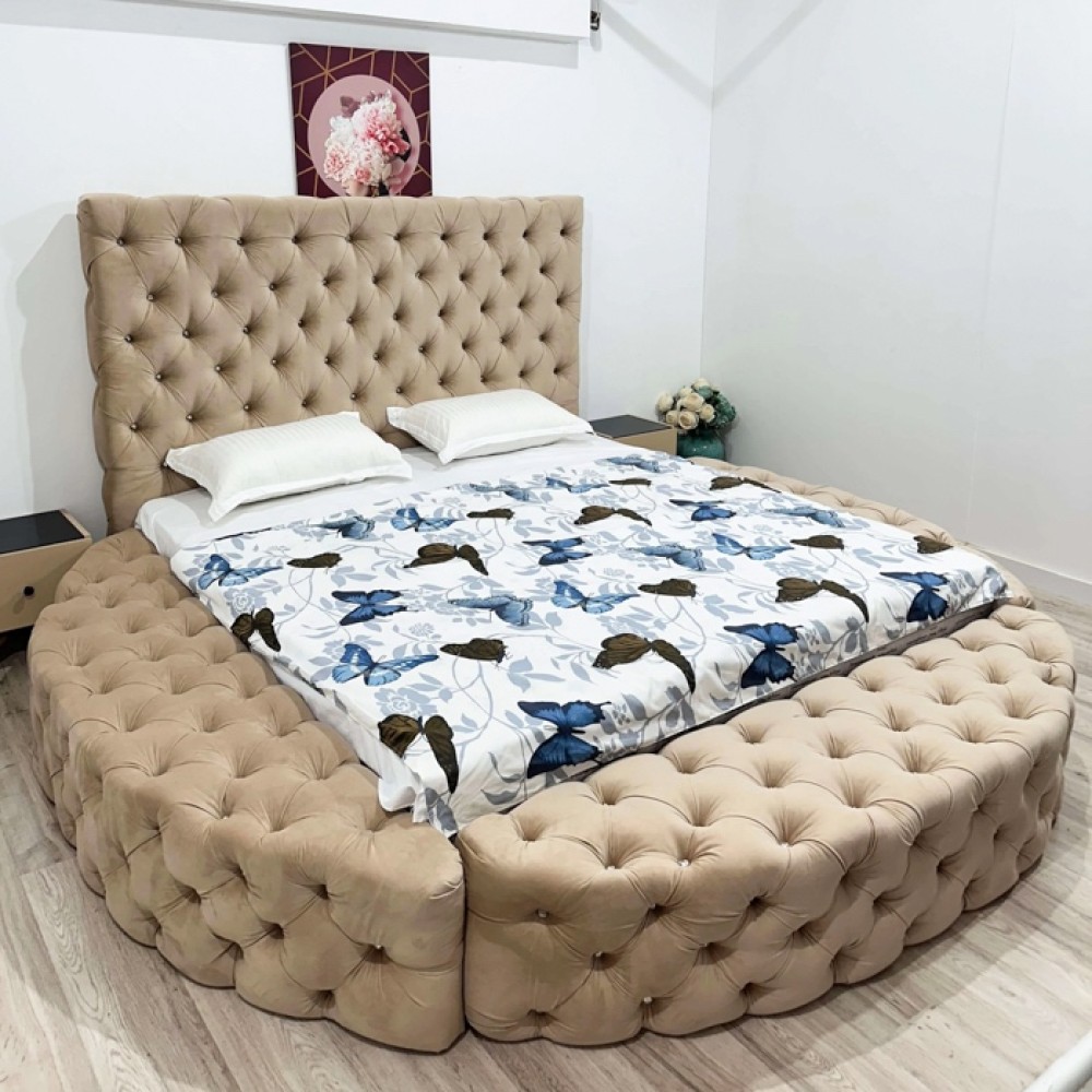 Acest pat tapițat rotund în stil Chesterfield este o piesă de mobilier deosebită, care se remarcă printr-un design clasic și luxuriant, potrivit pentru dormitoarele spațioase.