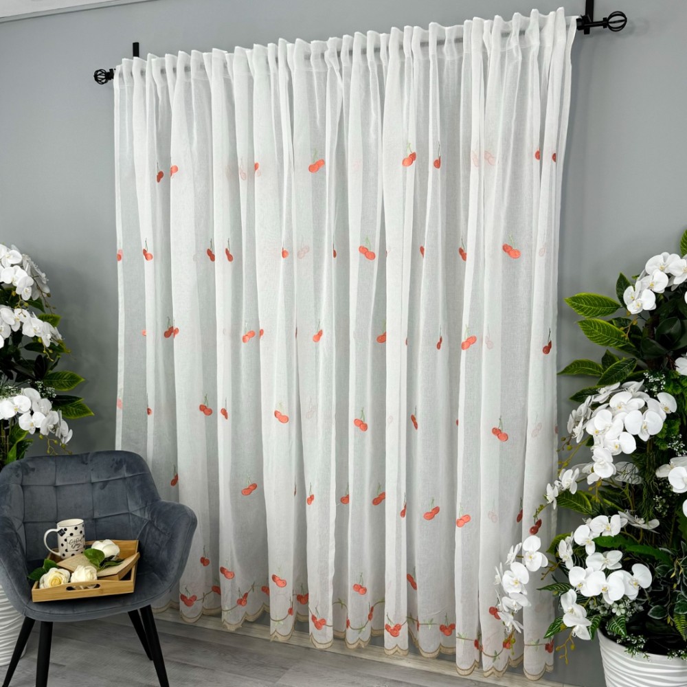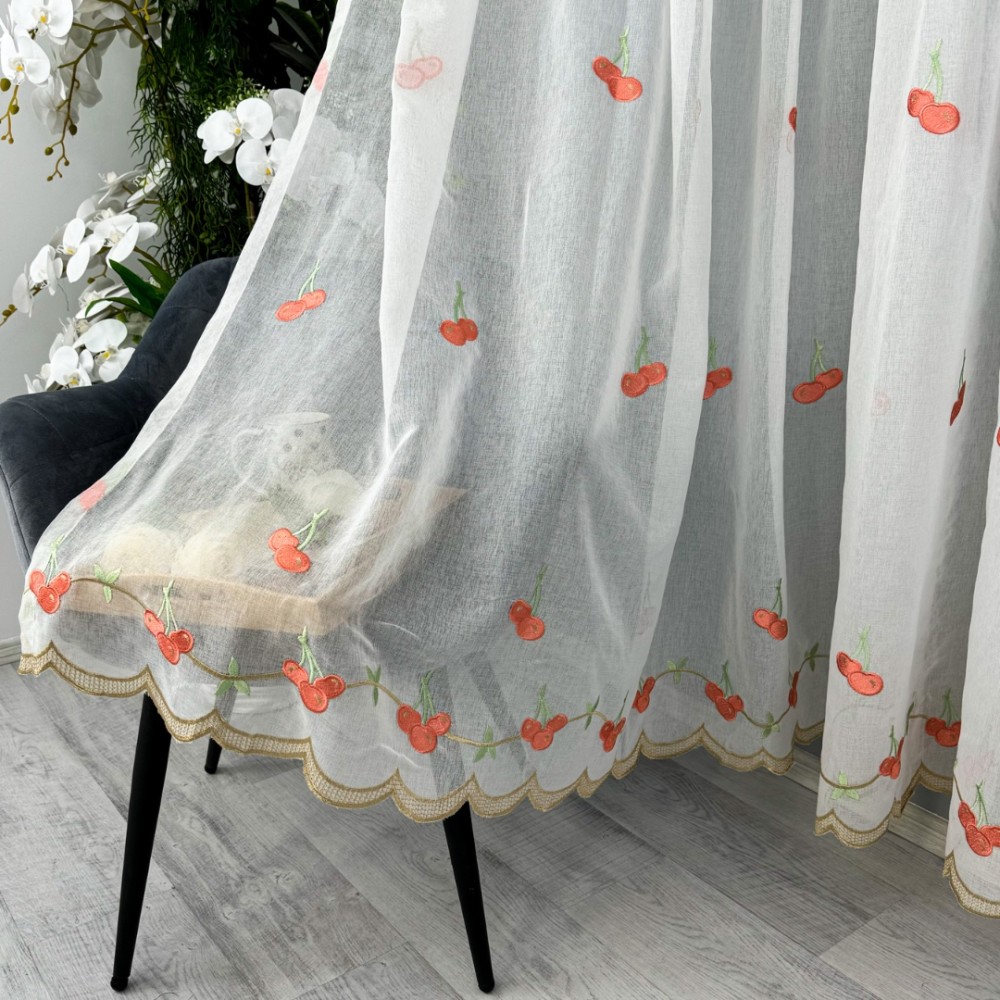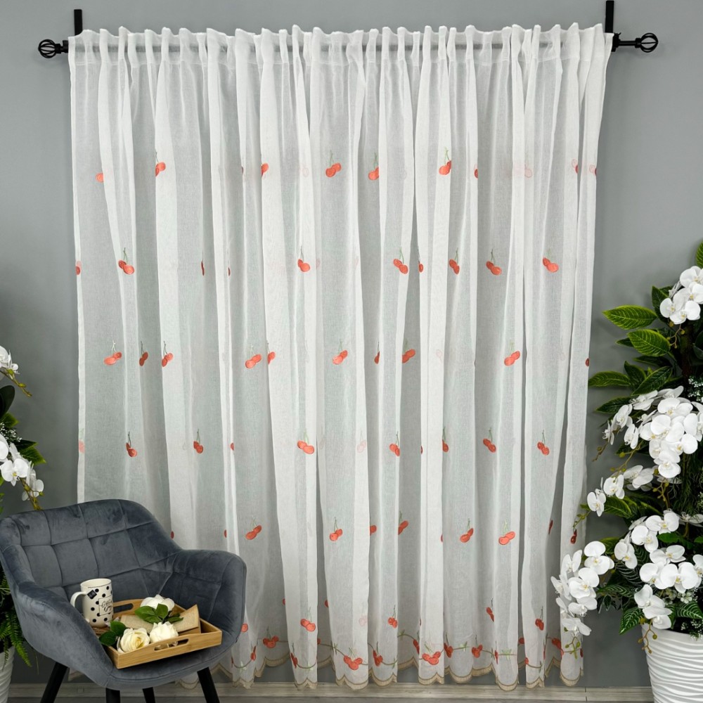 Perdea pentru Bucatarie tip IN brodat, Alb cu cirese, 140cm latime x 200cm inaltime, cu rejansa pt bara, CumparaMisim, cod produs: BPD205