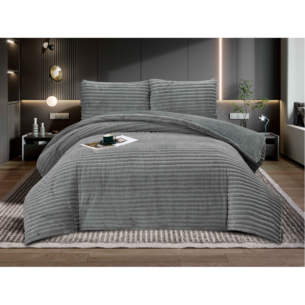 Pilota Cocolino Rabbit, 200x230cm si 2 fete de perna 50x70cm, Dungi Gofrate, Dublata cu Blanita Asortata Sherpa, Gri inchis, Pucioasa Fashion Casa, cod produs: SKT-PR-02