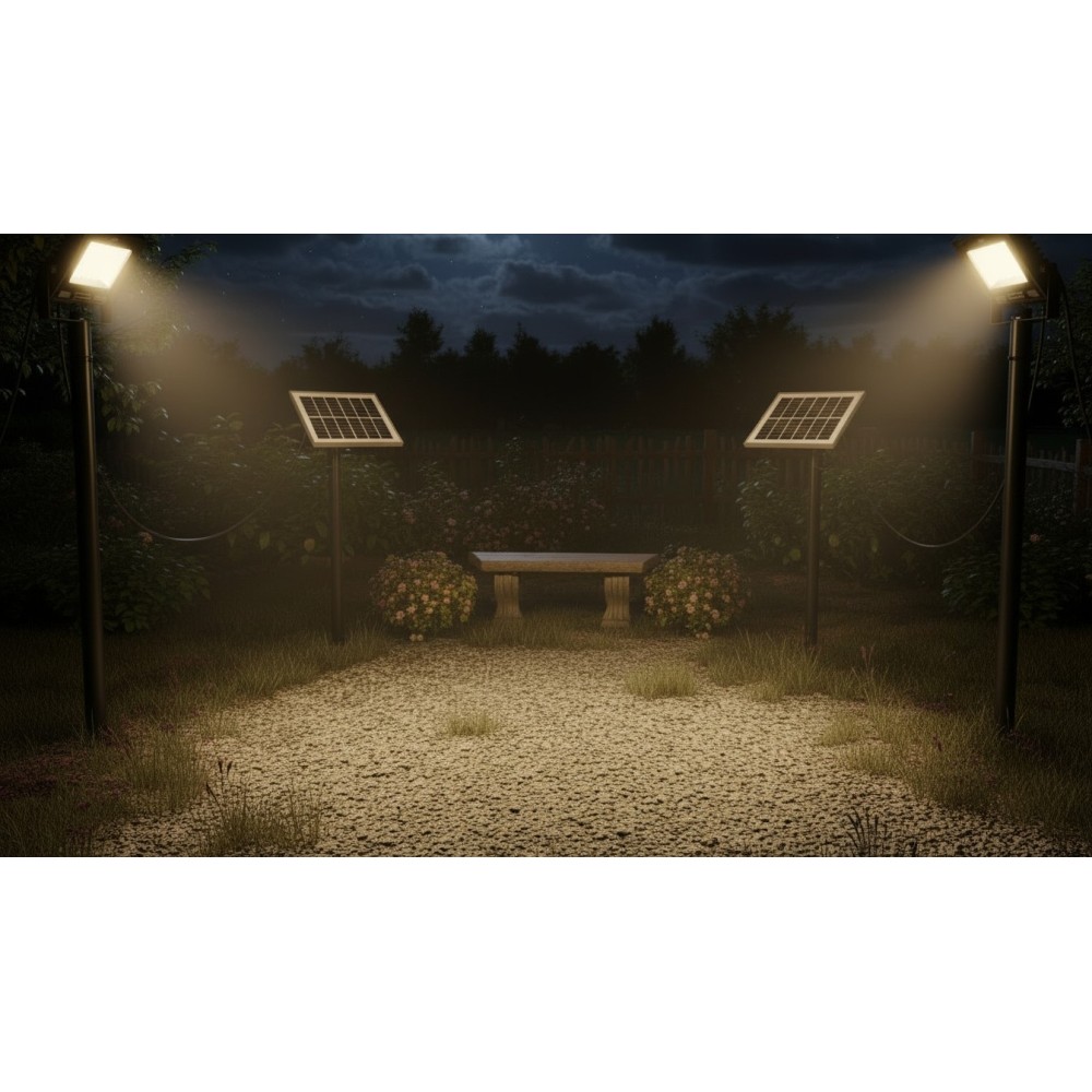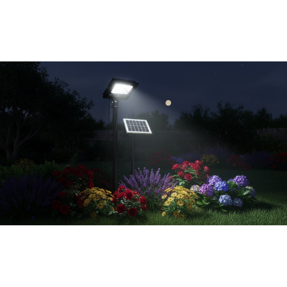 Datorita panoului fotovoltaic performant, proiectorul capteaza energia solara pe timpul zilei si o stocheaza in acumulatorul Lithium integrat, oferindu-ti o autonomie de pana la 10 ore. Telecomanda inclusa iti ofera control total asupra functionarii: poti aprinde sau stinge lumina, regla intensitatea, activa modul automat sau seta timpul de functionare, totul printr-o simpla apasare de buton.
