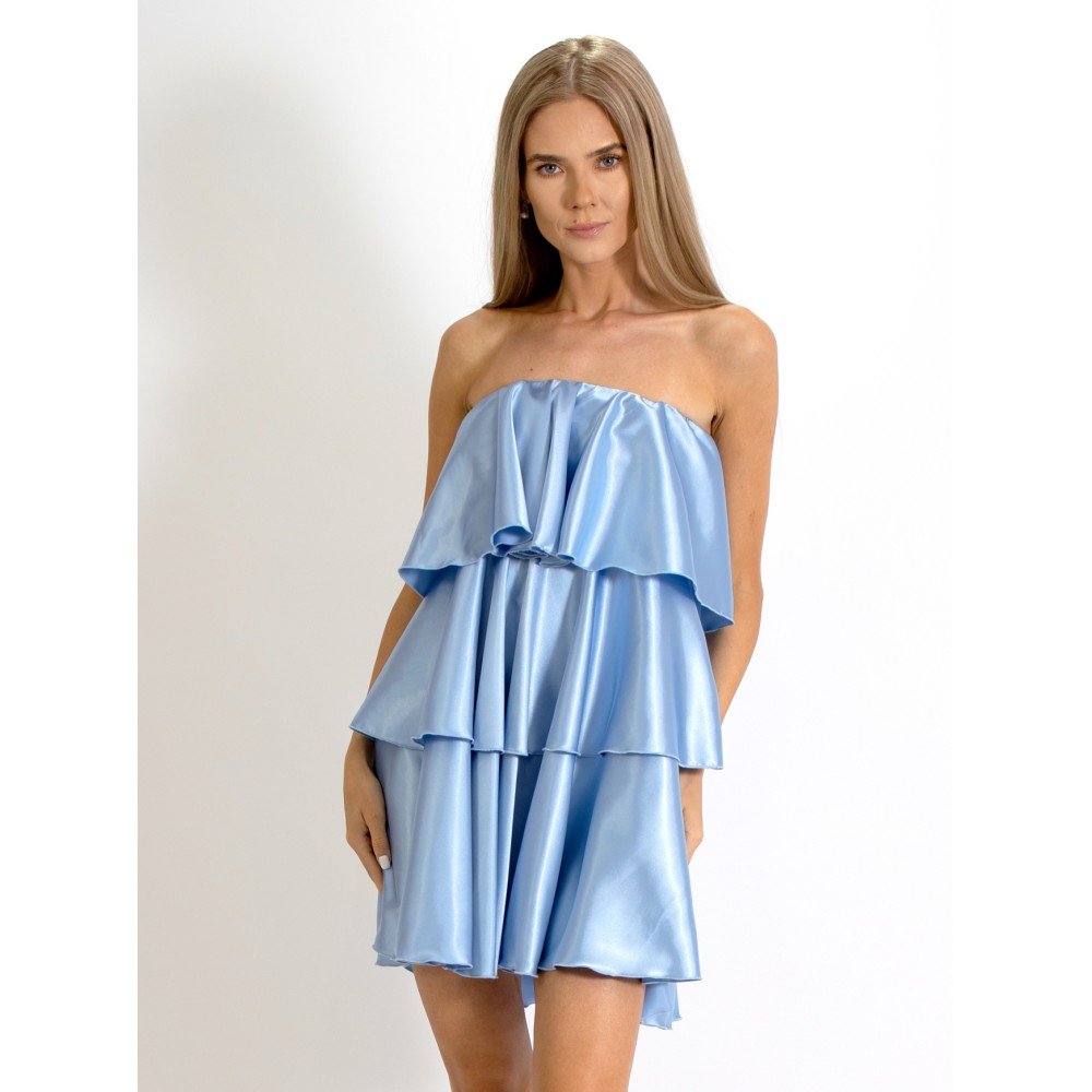 Rochie scurta cu corset pe interior, fara bretele, cu volanase, din Satin. Rochita se inchide cu fermoar la spate.