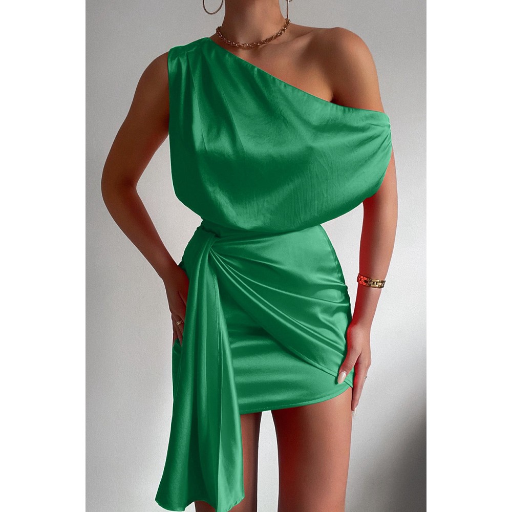 Rochie din Satin, cu decolteu tip barcuta, si partea jos cu croi drept, cu efect parte peste parte. Se inchide cu fermoar in lateral.