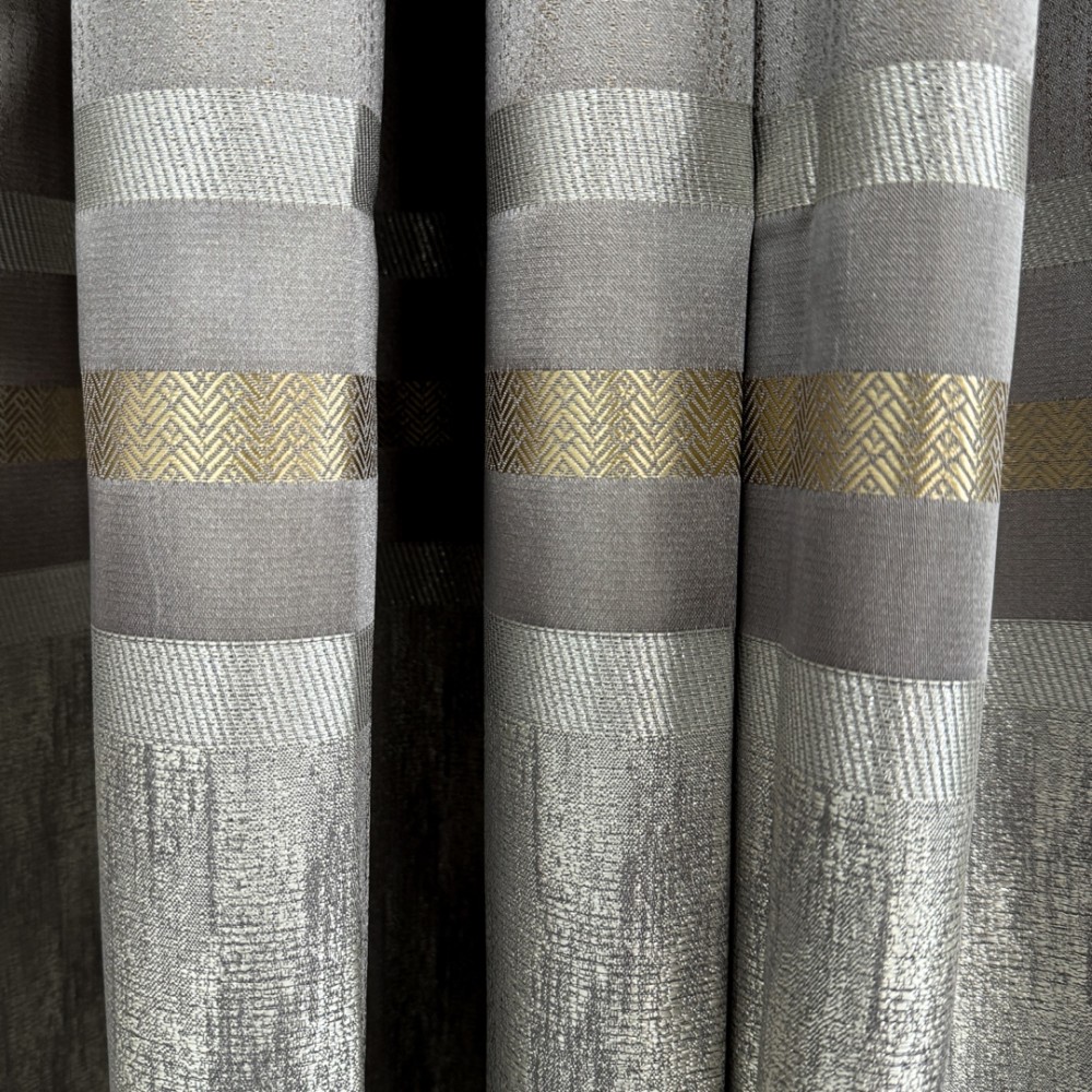 Ceea ce face draperiile cu adevărat remarcabile sunt detaliile aurii. Aceste insertii metalizate adaugă un element de strălucire și glamour, creând un contrast elegant cu textura mată a materialului. Fie că sunt plasate într-un living, într-un dormitor sau într-o sală de mese, draperiile cu insertii aurii atrag atenția și conferă o notă de opulență.