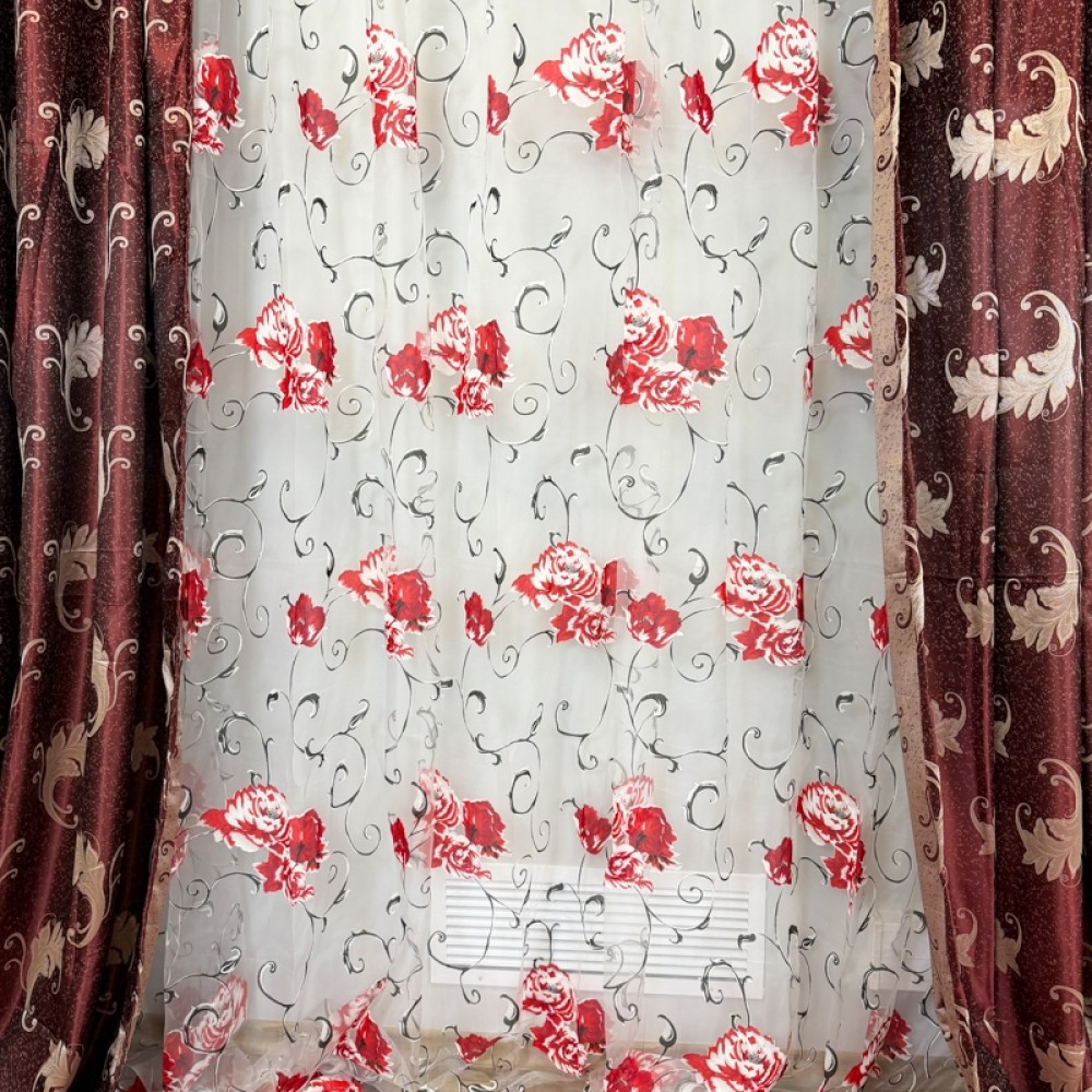 Set 2 Draperii Jacquard, Frunze, 150cm latime x 270cm înălțime, Grena + Perdea 400cm latime x 270cm inaltime, din Matase Imprimata, Bujori Rosii, CumparaMisim, cod produs: DTD-ST-20
