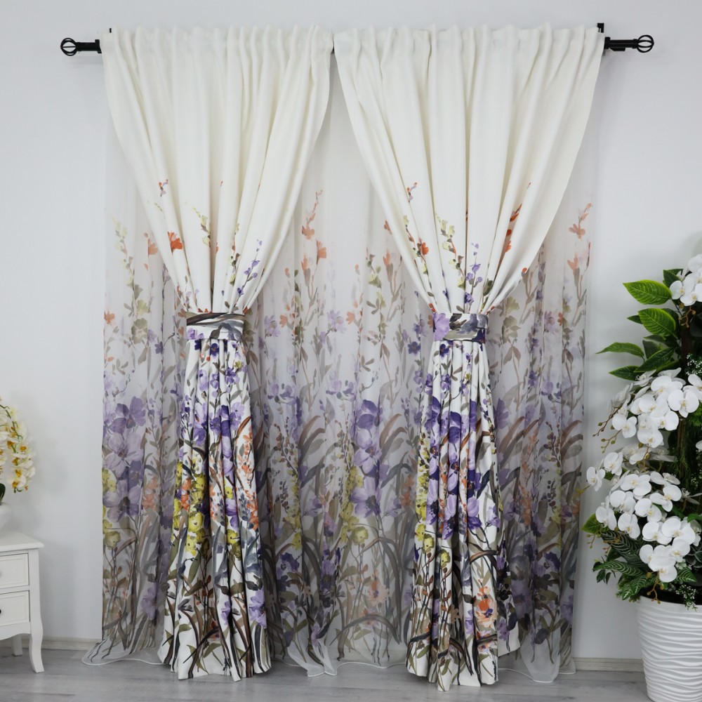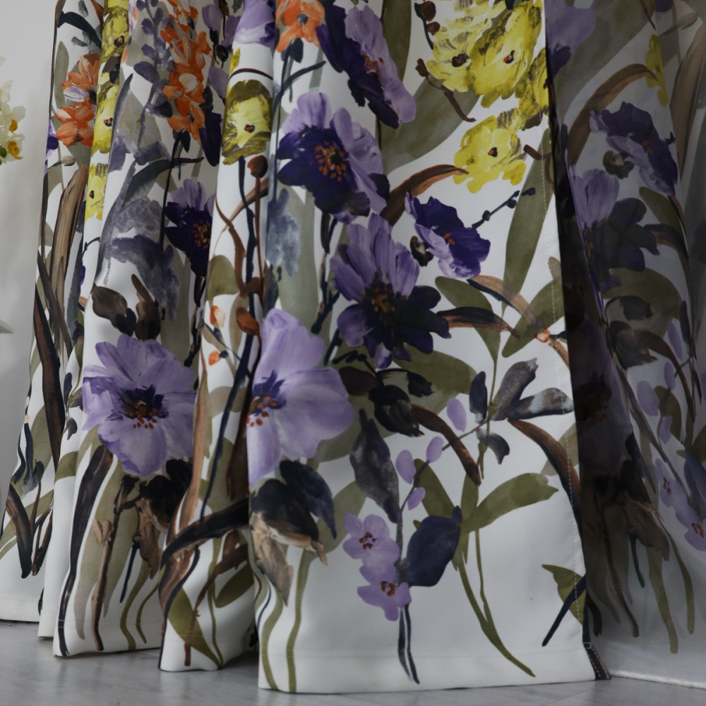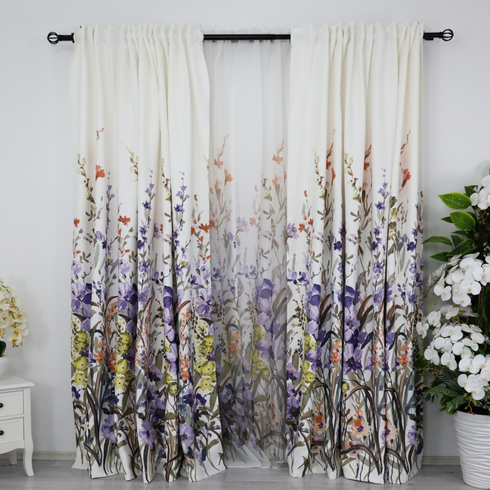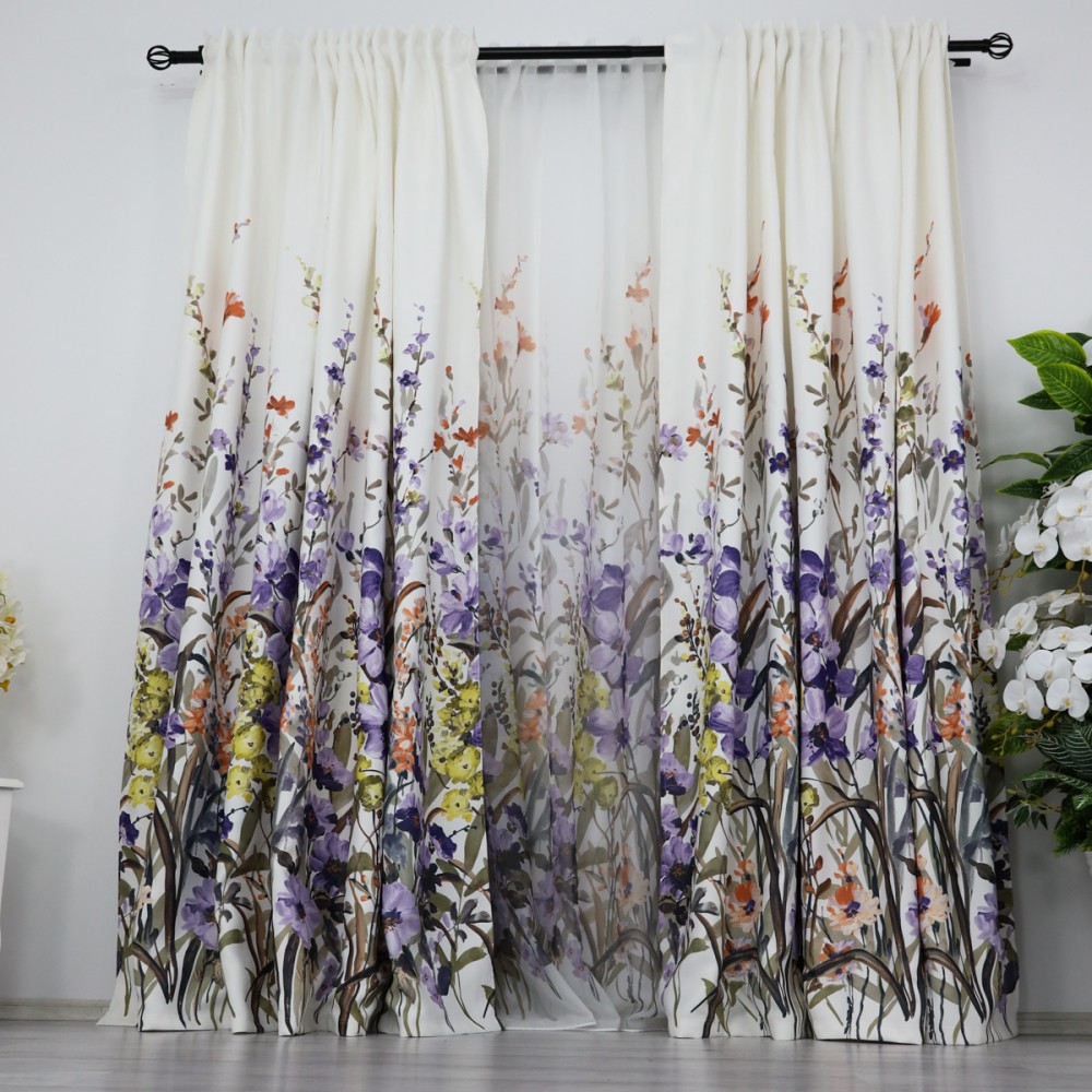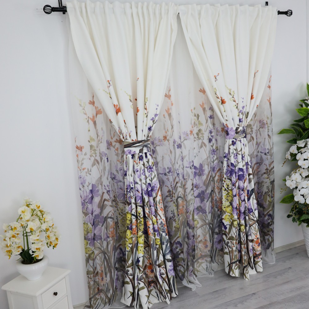 Set 2 Draperii Satinate Imprimate, flori mov, 140cm latime x 260cm inaltime, cu tiv lat pt bara, CumparaMisim, cod produs: BDR4