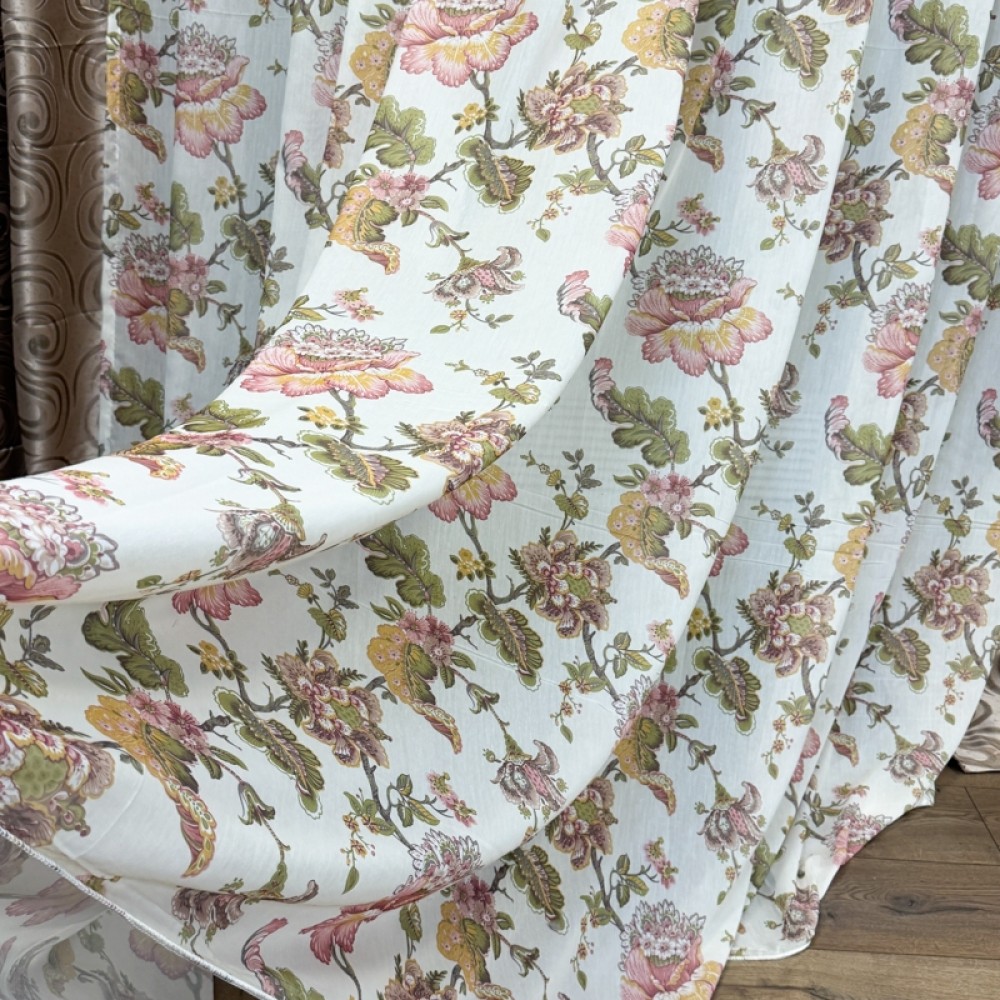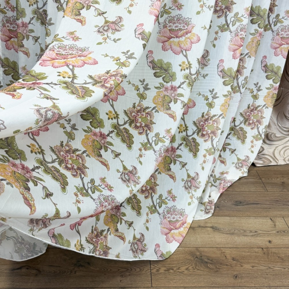 Perdeaua este realizată din 100% poliester cu aspect de mătase imprimată, având o textură fină și o cădere naturală elegantă. Dimensiunea generoasă de 400 cm lățime x 270 cm înălțime permite o drapare bogată și armonioasă. Sistemul de prindere este prevăzut cu rejanță tip creion de 6 cm pentru șină, asigurând montaj rapid și falduri uniforme.