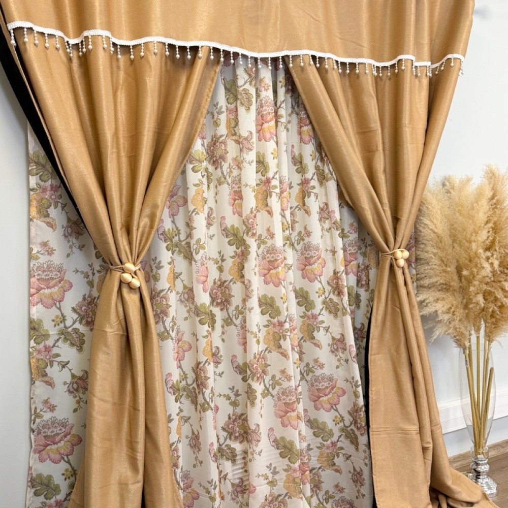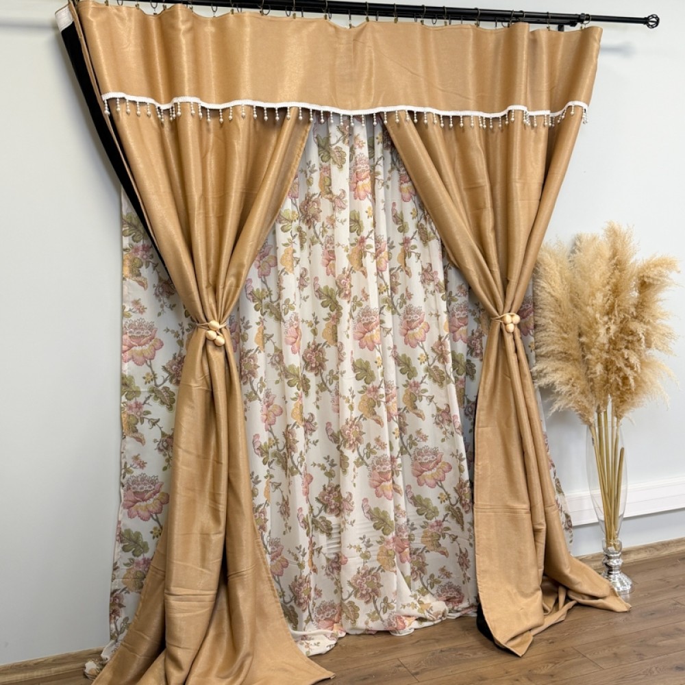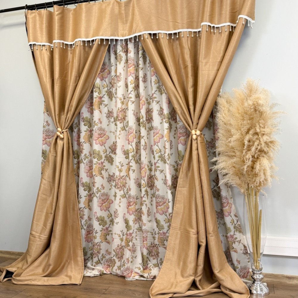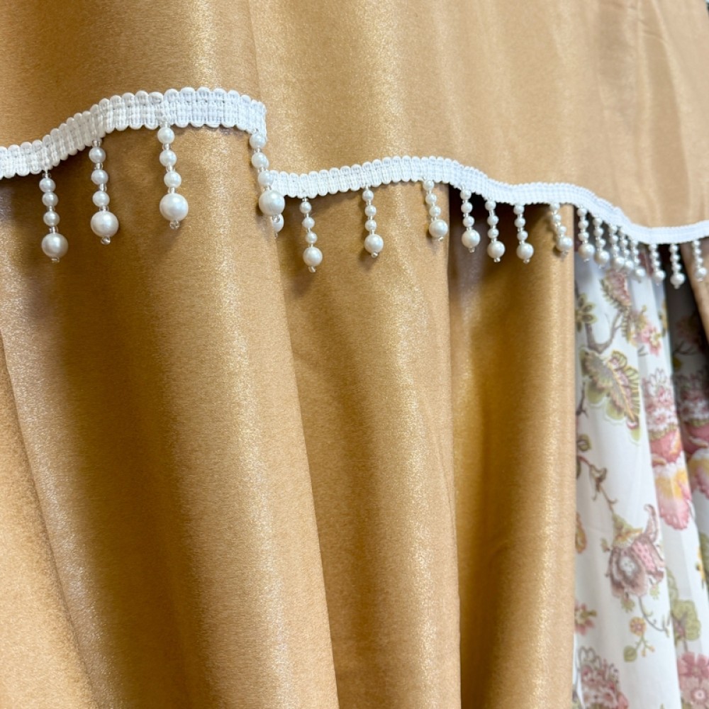 Draperia are dimensiunea de 150 cm lățime x 270 cm înălțime per bucată, însă este croită și cusută împreună într-o singură piesă cu lățimea totală de aproximativ 300 cm. Designul este completat de accesoriu decorativ cu perle, care adaugă un plus de eleganță și rafinament. Sistemul de prindere este realizat cu rejanță tip creion de 6 cm pentru șină, pentru o montare ușoară și falduri uniforme.