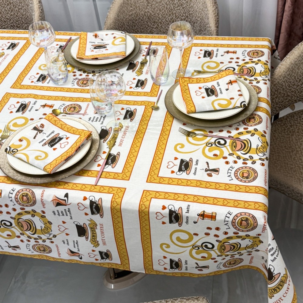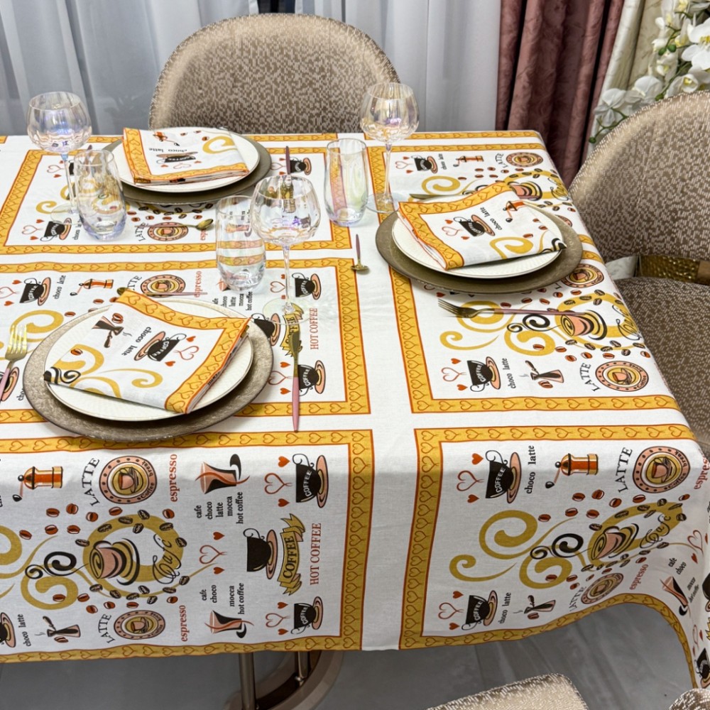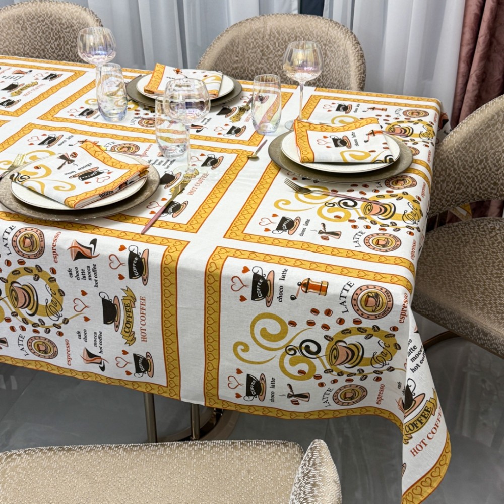 Set Față de Masă din Bumbac Imprimat cu 6 Șervețele – Eleganță și Calitate pentru Mese Perfecte, Alb, Coffee, cod produs: CMP-FM-001