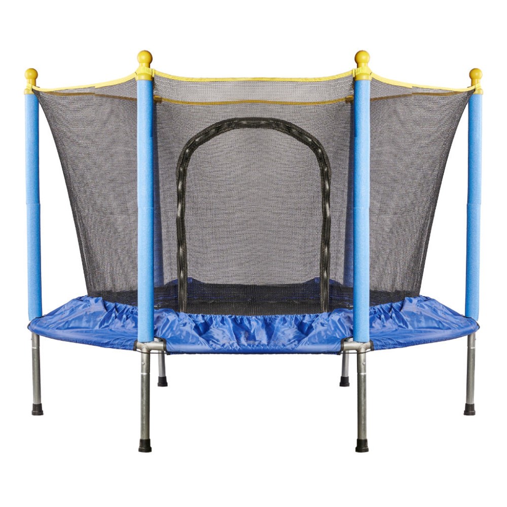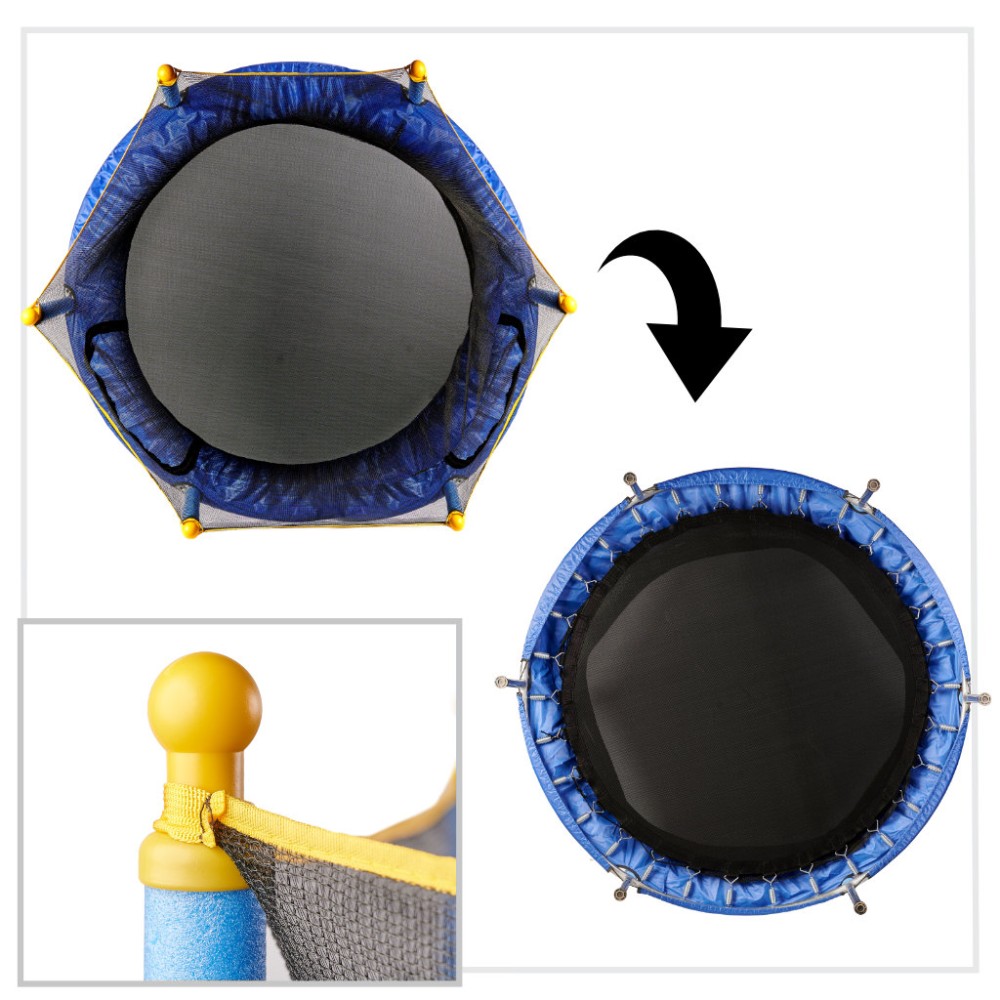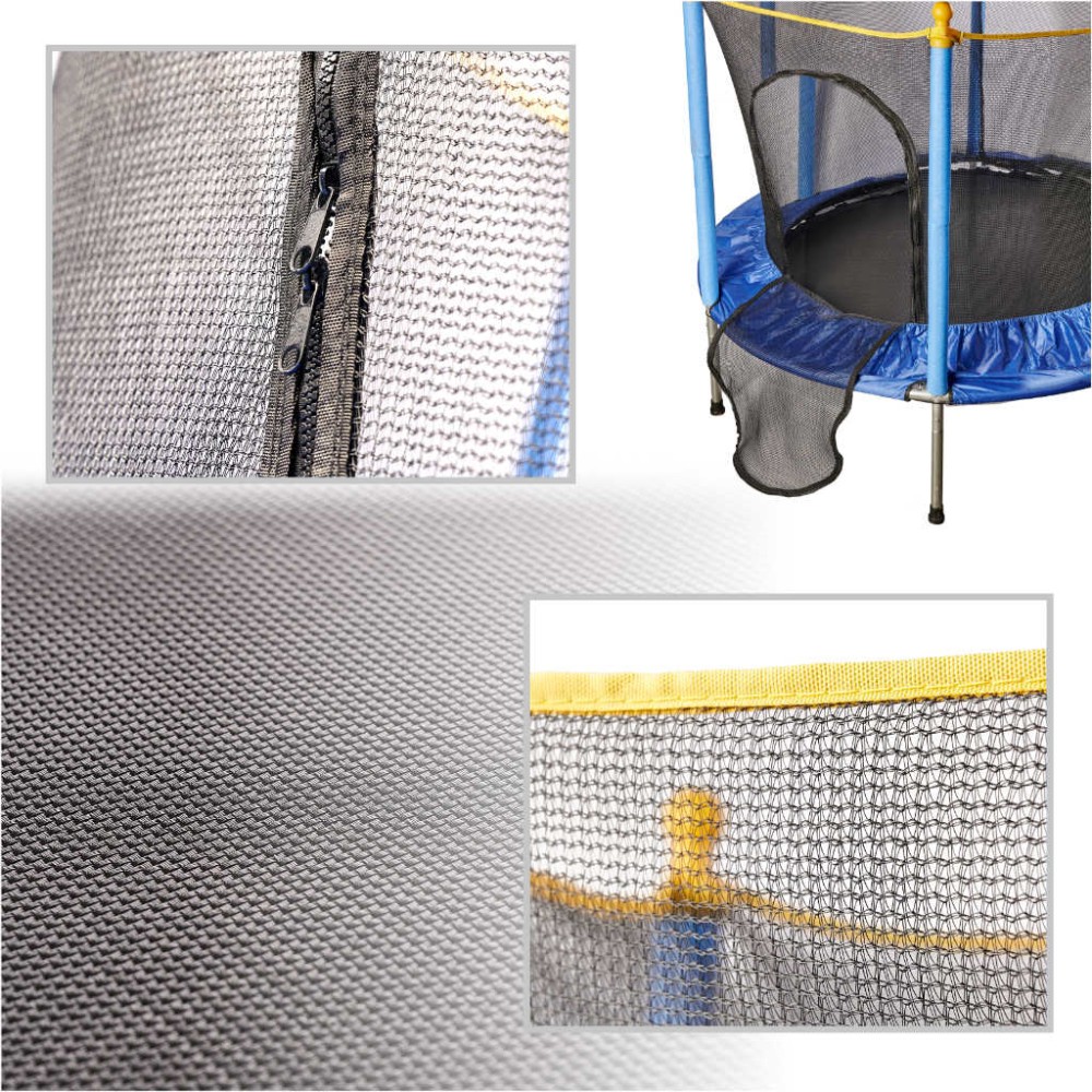Trambulina de gradina pentru copii. Include elemente de siguranță pentru sărituri: o plasă de siguranță, un capac de protecție pentru arc, precum și tampoane și huse de spumă pentru stâlpi. Dotat cu intrare cu fermoar. Covorasul flexibil (trambulina) asigura o saritura excelenta. Capacitatea maximă de încărcare este de 80 de kilograme.